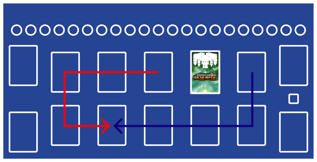 拠点の上からカードを1枚確認し、指定場所に以下の順番で配置してください。