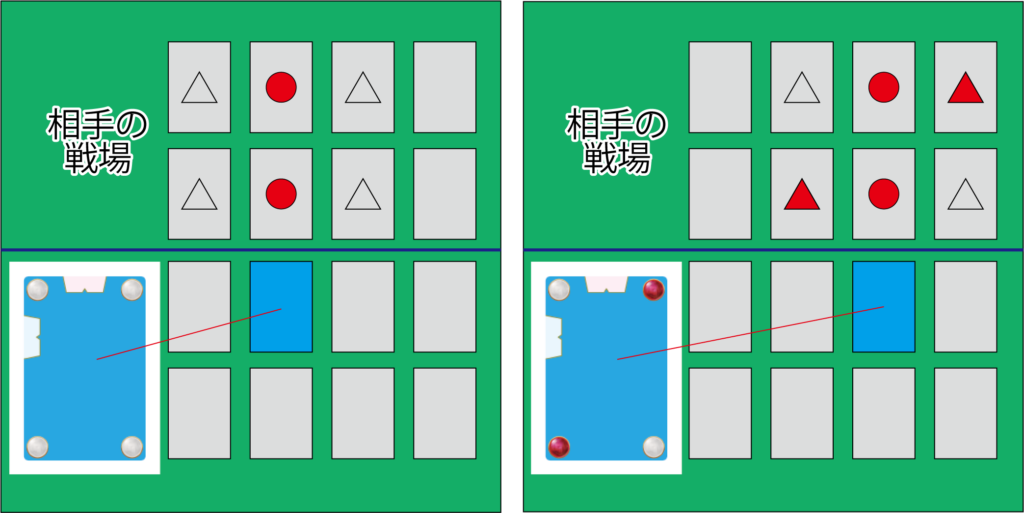 戦場に配置している場所から前方1∼2マスを「共通攻撃範囲」と呼び(下図〇)、その名の通り全カードに共通する攻撃範囲となります。