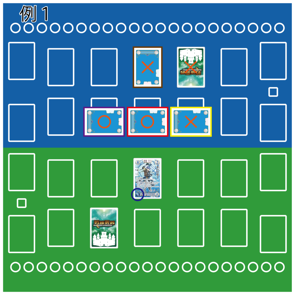 戦場[緑]のレイカさんが攻撃側、戦場[青」のロディーナさんが守備側の場合で説明するよ。