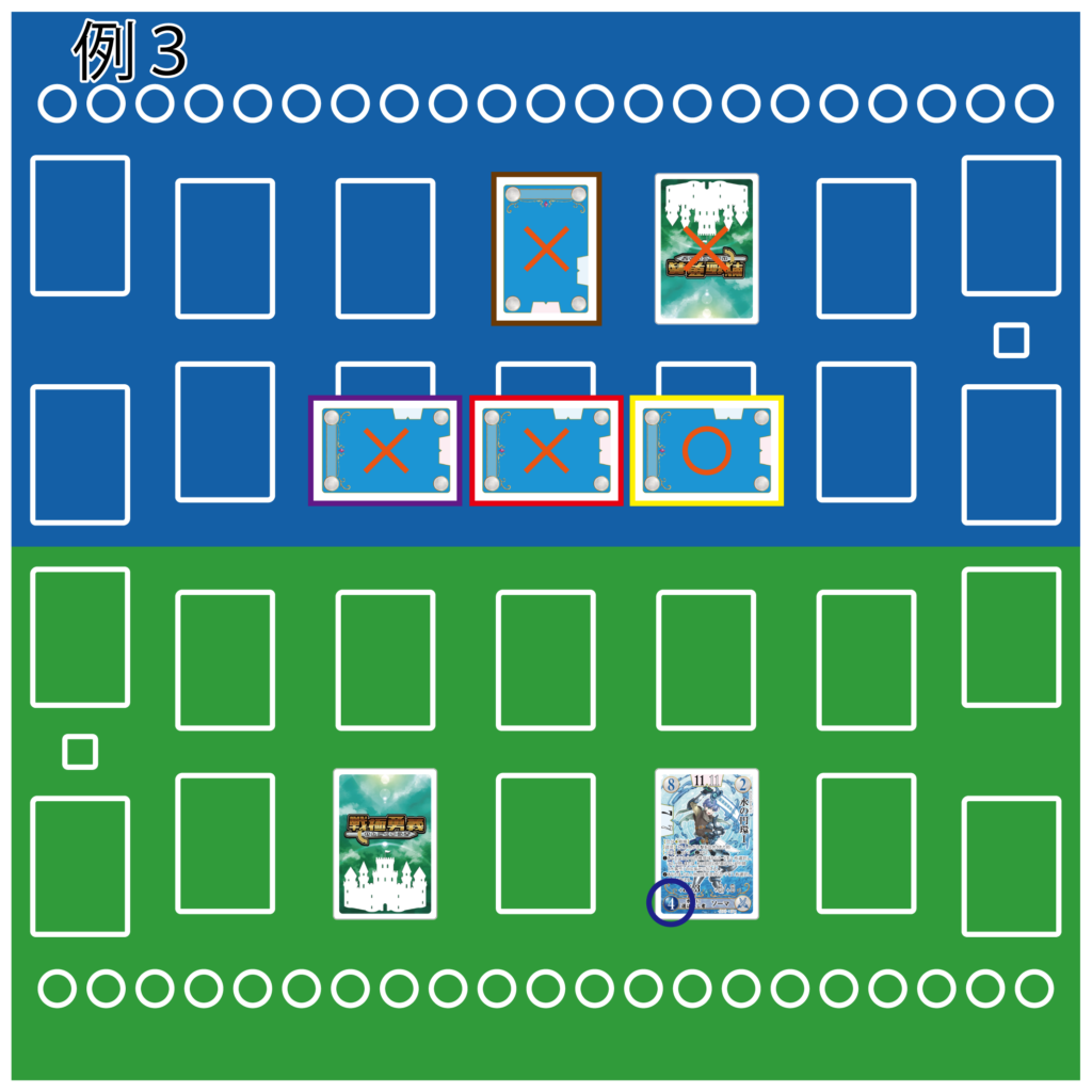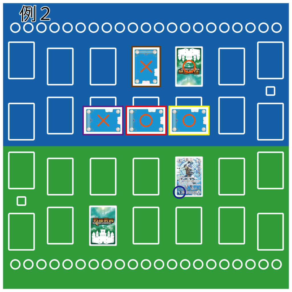 攻撃を宣言された仲間の攻撃範囲に従い、守備表示の敵または相手の拠点を選択します。