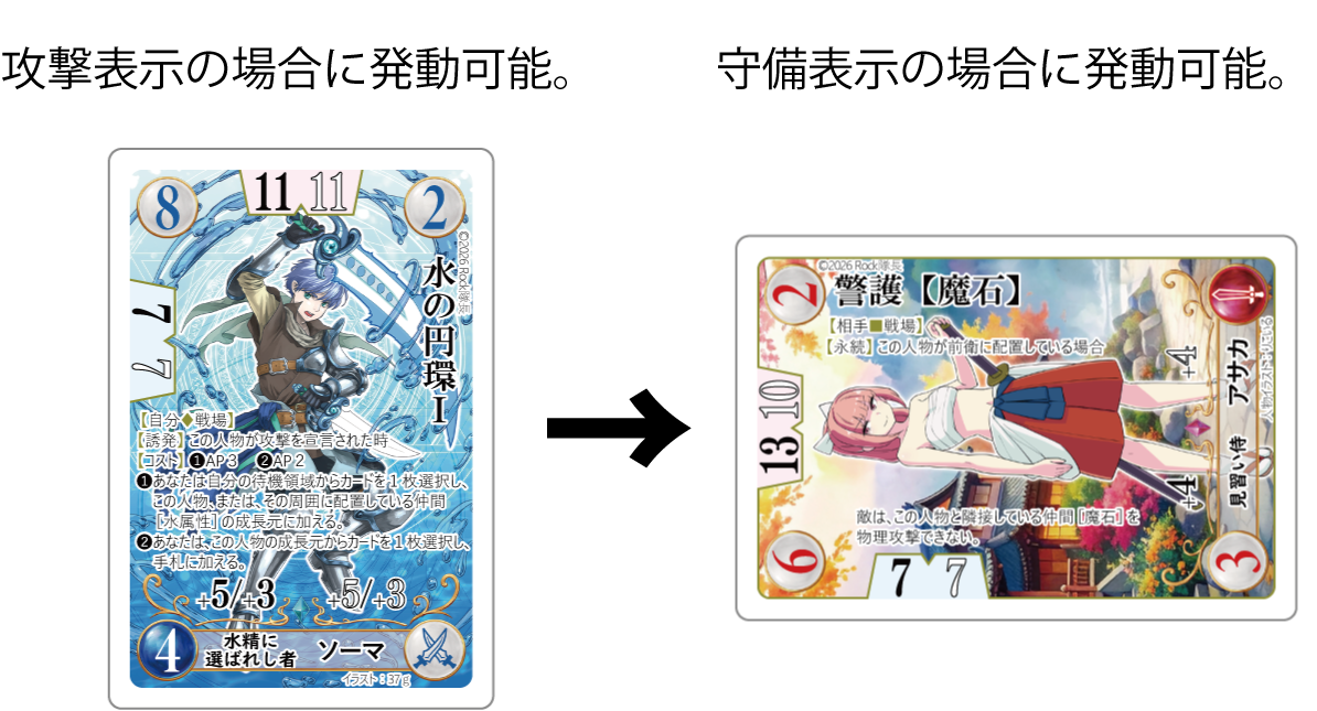 能力名が縦書きの場合、攻撃表示の時に発動できることを、横書きの場合、守備表示の時に発動できることを表しています。