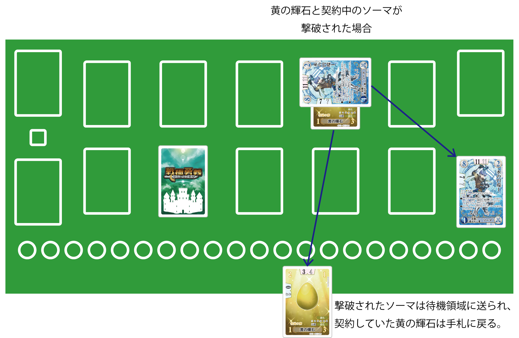 進化元に“眷属の卵”を持つ解放状態の眷属が、戦闘で撃破されるなどの理由で戦場から離れた場合、眷属カードは進化元も含めて召喚領域に送られますが、眷属の卵は手札に戻ります。
