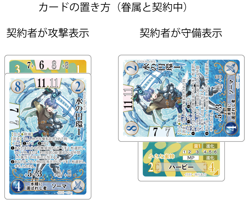 プレイヤーは自分の手札から眷属カードを1枚選択します。その契約コスト(AP)を消費したら、戦場または統率領域から攻撃表示の人物を1人選択し、その下に眷属カードを置きます。これを「契約」と呼びます。