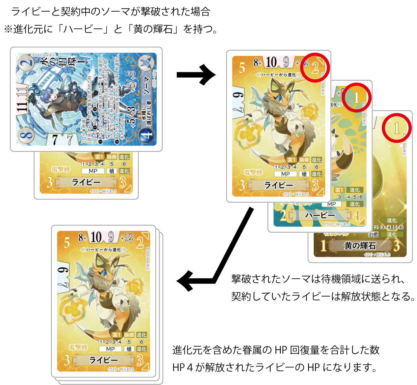 契約状態の進化と違う点は、解放状態の眷属が進化する際、進化先である眷属カードのチャージ量と同じ数だけ眷属のHPを増やせるっていう点だね。