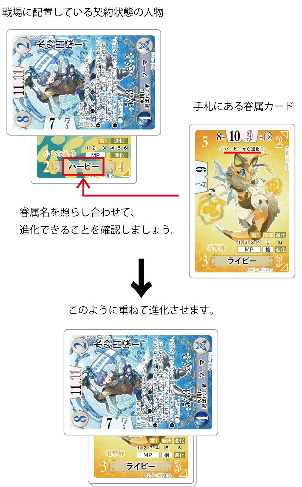 解放状態の眷属を対象に、その進化先となるカードを手札から1枚選択したら、対象の上に重ねるんだ。